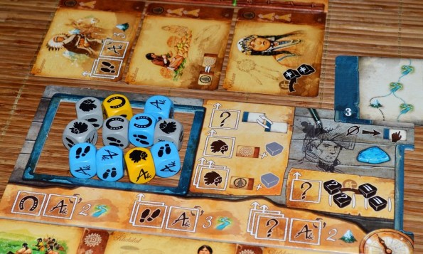 Что касается найма индейцев, то в этом случае игрок не только выбирает одну из трёх карт племён, но и получает и тут же бросает нейтральный серый кубик. Свойства у карт племён делятся на два основных типа: одни являются более привлекательными источниками речных и горных значков, а другие позволяют эффективней оперировать своими кубиками (допустим, при выборе действия “смена грани”, игрок вправе выставлять разные символы).