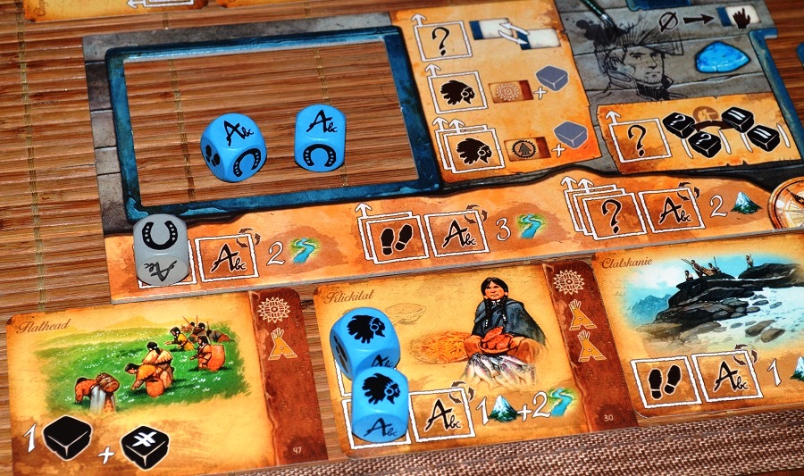 Что касается найма индейцев, то в этом случае игрок не только выбирает одну из трёх карт племён, но и получает и тут же бросает нейтральный серый кубик. Свойства у карт племён делятся на два основных типа: одни являются более привлекательными источниками речных и горных значков, а другие позволяют эффективней оперировать своими кубиками (допустим, при выборе действия “смена грани”, игрок вправе выставлять разные символы).