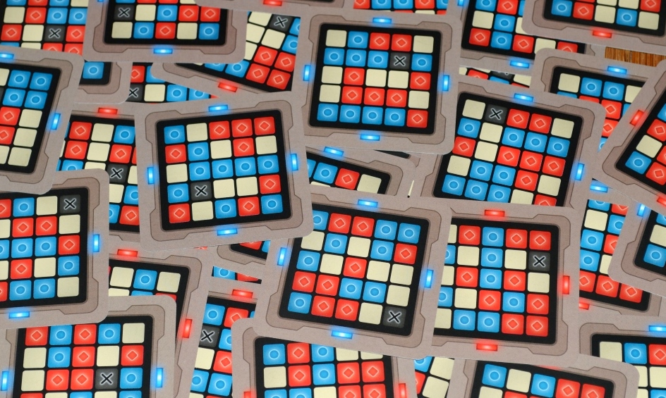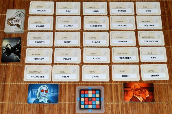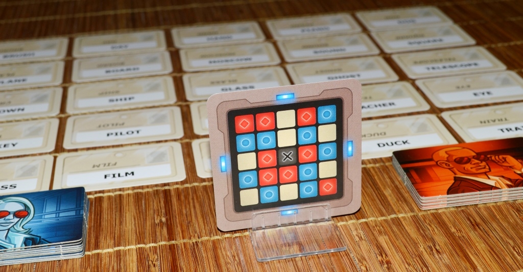 Подготовка смешная: рандомно выкладываем на стол карточки со словами сеткой 5 на 5 штук, да кладём рядом тайлы “выбывших” слов. В завершение ведущие берут из коробки случайную карту ключа (держат они её в секрете), которая указывает, какие слова относятся к красной команде, а какие – к синей. С помощью лампочек по краям карты ключ ещё и случайным образом определяет того, кто начинает. Этой команде придётся разгадывать на одно слово больше, для этого предусмотрен специальный дополнительный тайл.