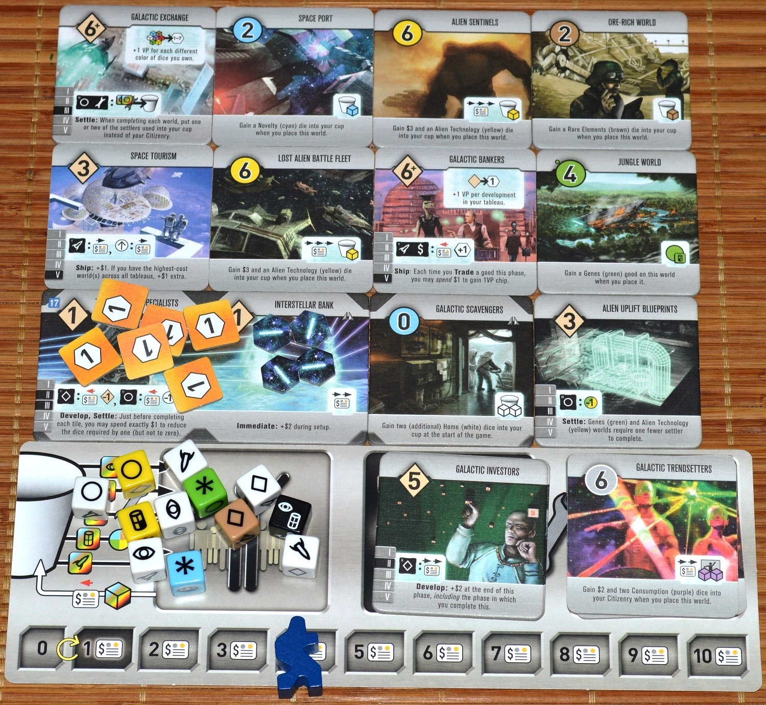 Я, в принципе, по каждому пункту уже высказался, но хотелось бы обобщить. Начну с того, что база Roll for the Galaxy – совершенно самодостаточна, в ней столько всего, что, сыграв более двадцати партий, мы даже не помышляли о дополнении. Конечно, когда его анонсировали, я был в восторге, ведь Roll – одна из самых любимых моих настолок. Немного настораживало отсутствие тайлов для мешка, но после изучения остального добра, сомнения отпали.