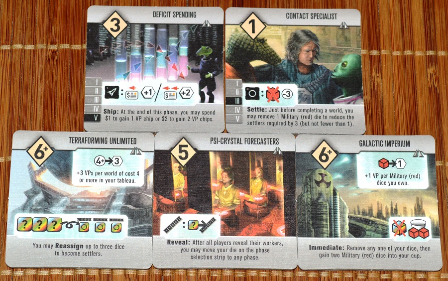 На сторонах с технологиями имеются две мощные шестёрки: на красные военные кубы и дорогие планеты. Понравилось свойство “Специалиста по связям”, который позволяет снизить стоимость планеты на 3 путём утилизации красного кубика. Насколько я понял, подобные карты были в “Гонке”.