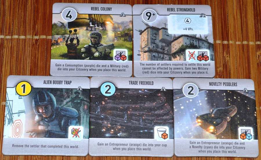 В мешок добавляется всего пять новых тайлов, но зато каких. Одна планета даёт 4 дополнительных ПО, но на неё потребуется аж 9 рабочих. Другая – вкусная жёлтая – стоит всего один кубик, но после строительства этот кубик уничтожается.