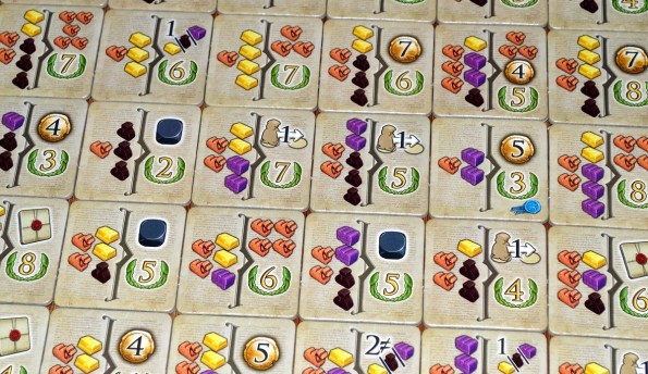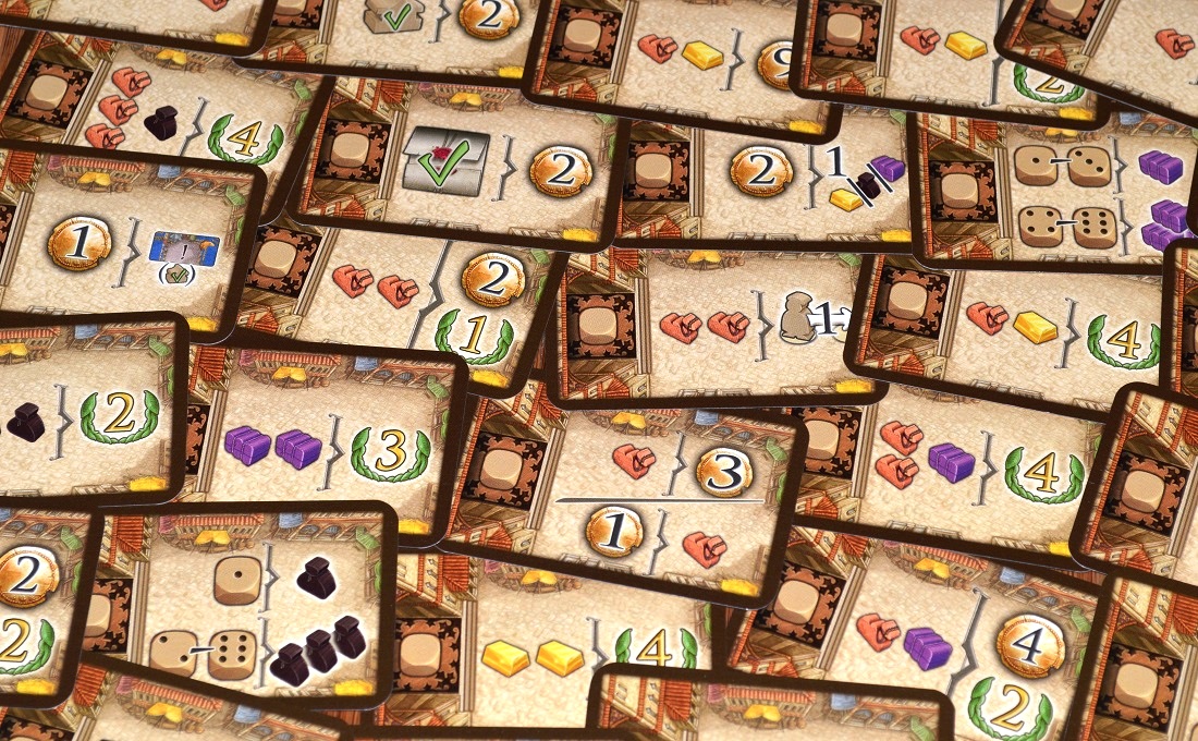 Понравилась и лаконичная кубиковая механика. А именно, как здорово в ней сбалансированы удачные и не очень броски. Понятно, что большие значения на кубах принесут больше товаров и всё такое. Зато низкие позволяют задёшево активировать уже занятые действия. Дело в том, что если место с действием заблокировано соперником, то чтобы им воспользоваться, потребуется заплатить монеты согласно кубику с самым низким значением. Кстати, совсем провальные броски также компенсируются – если на всех кубах выпало меньше 15, то игрок берёт разницу деньгами.