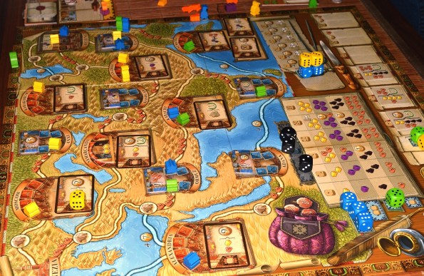 Все начинают с набором кубиков своего цвета, фишками торговых постов (ими помечаются “взятые” города) и тайлом персонажа с уникальным свойством. В начале каждого раунда игроки бросают кубы, а потом по очереди их расставляют на специальные места, выполняя соответствующие действия.