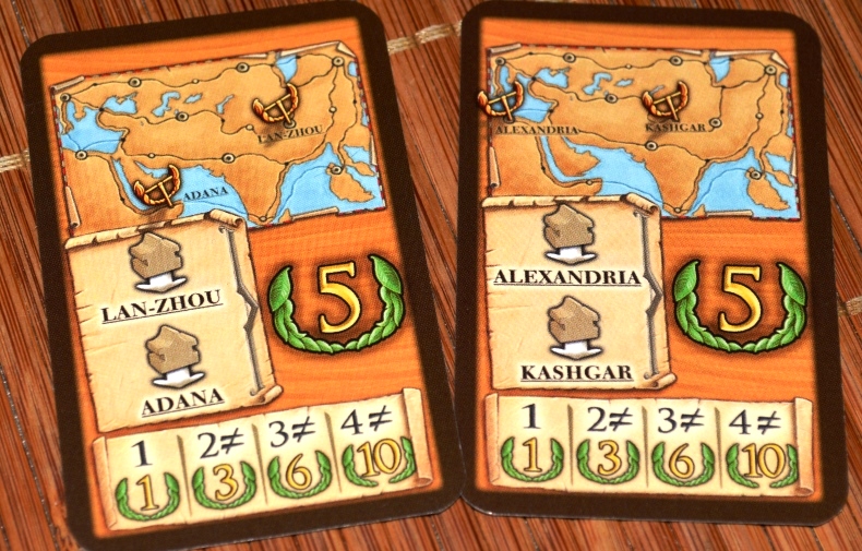 Следующая партия не заставила себя долго ждать, ведь игру мы толком не распробовали. После неё поняли, что недооценили бесплатные действия, которые за верблюдов позволяют перебрасывать кубики, повышать/понижать их значения и докупать нейтральные чёрные. Вдобавок, мы обнаружили дополнительные возможности для передвижения (рынок, бонусы заказов). Всё это сделало выполнение тайных маршрутов реальным, теперь наши подопечные лихо доходили до Пекина и даже возвращались обратно.
