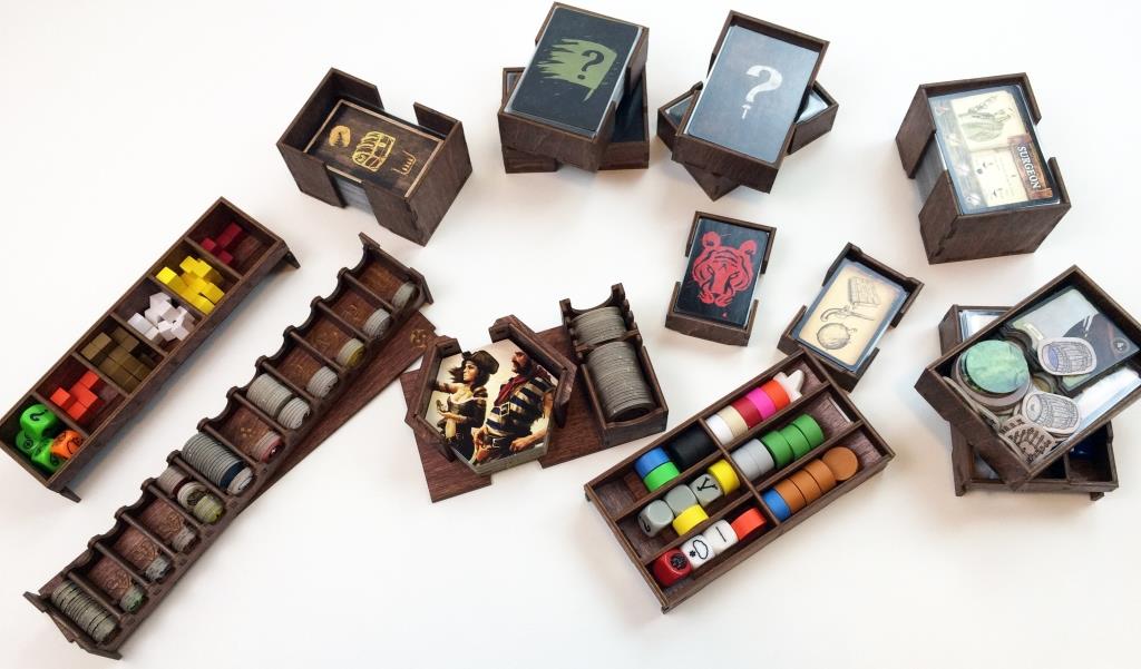 Я падок на различные аксессуары для настолок и уже давно заглядывался на творения забугорных умельцев, превращающих листы фанеры в чудесные органайзеры. Там отдельные люди и даже целые компании снабдят вашу любимую игрушку подставками и разделителями для карт, коробочками для ресурсов, башнями для кубиков и т.д. В общем, всем, что душе угодно, только плати.