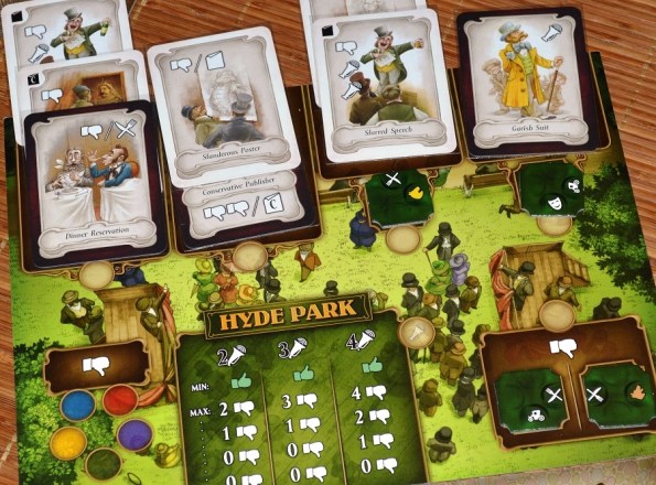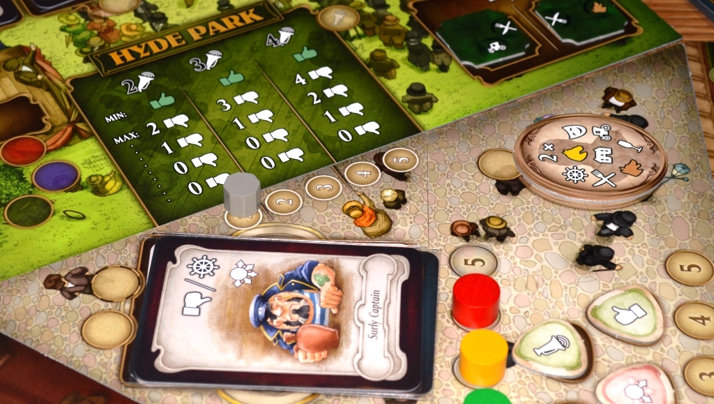 Как и в Last Will, на каждом из полей имеются места под конкретные карты и локации, куда можно ставить свои “шапочки” и тем самым активировать указанные действия. Хоть и все модули работают по схожему принципу, у них имеются и свои отличительные особенности. Например, в случае с выборами это специальные политические жетоны, которые складываются в мозаику и снабжают игрока дополнительными символами развлечений (два одинаковых соприкасающихся значка = 1 символ для эффектов карт).