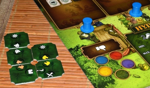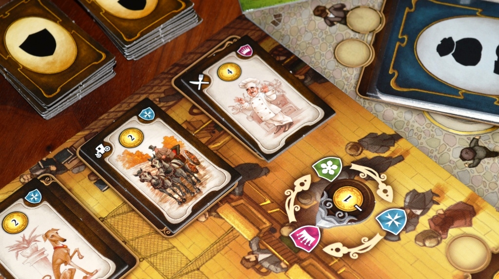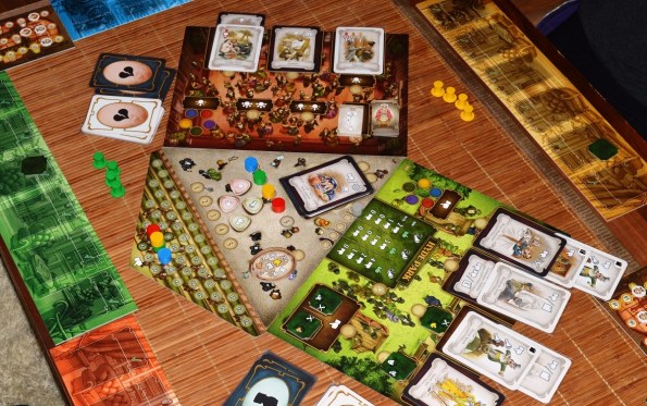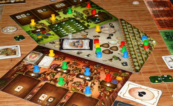 Да, есть ещё центральное поле со своей мини-колодой и парочкой действий. Одно из них, установка новой очерёдности хода, немаловажно, ибо карты на раунд выходят случайным образом, а локации с действиями вмещают лишь по одной фишке и тут же блокируются.