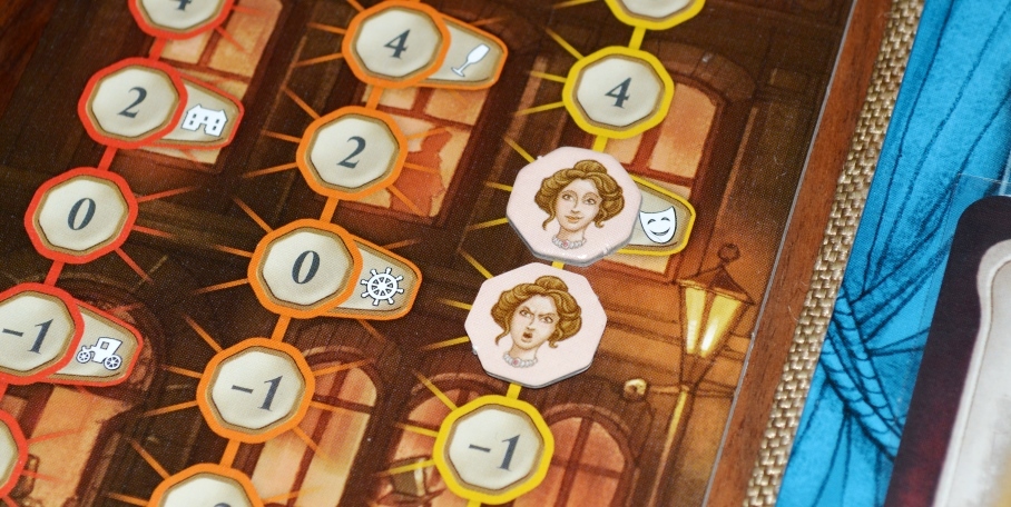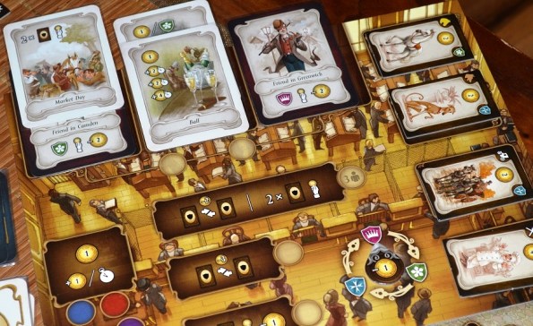 При игре с репутацией – тройной общественный трек и бабка-сплетница Беатрис, которую все ненавидят уже с первого раунда (она штрафует, если жетончики на треках соответствуют расположению, указанному на её жетоне).