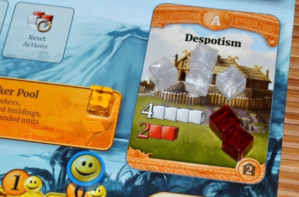 В поселениях царит деспотизм, о чём говорит оранжевая технология государственного строя. Эта карта показывает, сколько действий доступно игроку. Белые кубики – это мирные гражданские действия, красные – военные.