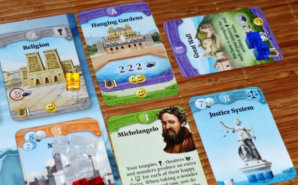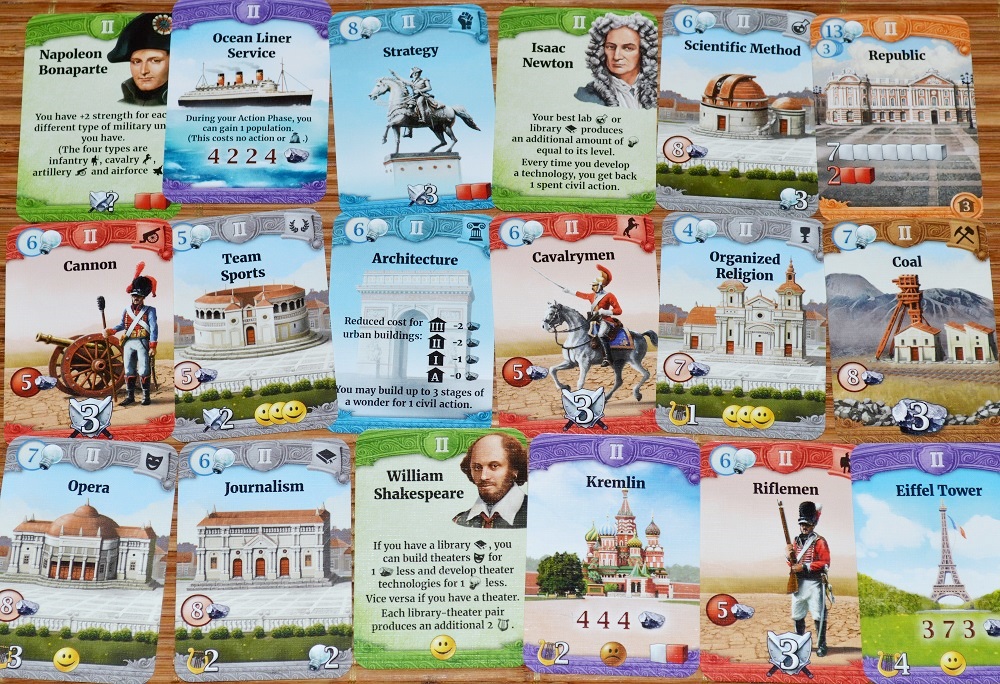 Первое, для чего нужны белые гражданские кубики – это получение карточек из длиннющего ряда. Стоимость карт варьируется от одного до трёх кубов. Карты представляют собой лидеров, Чудеса света, одноразовые действия и технологии (голубые – специальные, коричневые –производственные, серые – городские, красные – военные, оранжевые – государственный строй). Все они обладают некими характеристиками, которые повышают уровень цивилизации на треках или предоставляют бонусы в виде дополнительных кубиков действий, населения, ресурсов.