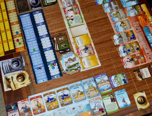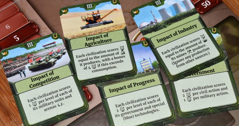 Ладно, пора закругляться, всё равно всех нюансов не описать. Партия заканчивается, когда опустеет колода третьей эпохи. К очкам, заработанным по ходу партии на культуре и войнах, добавляются очки за выполнение условий карт событий последней эпохи (сформированная игроками стопка разыгрывается целиком). Кто набрал больше всего очков, тот и молодец.
