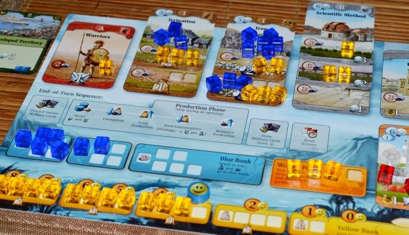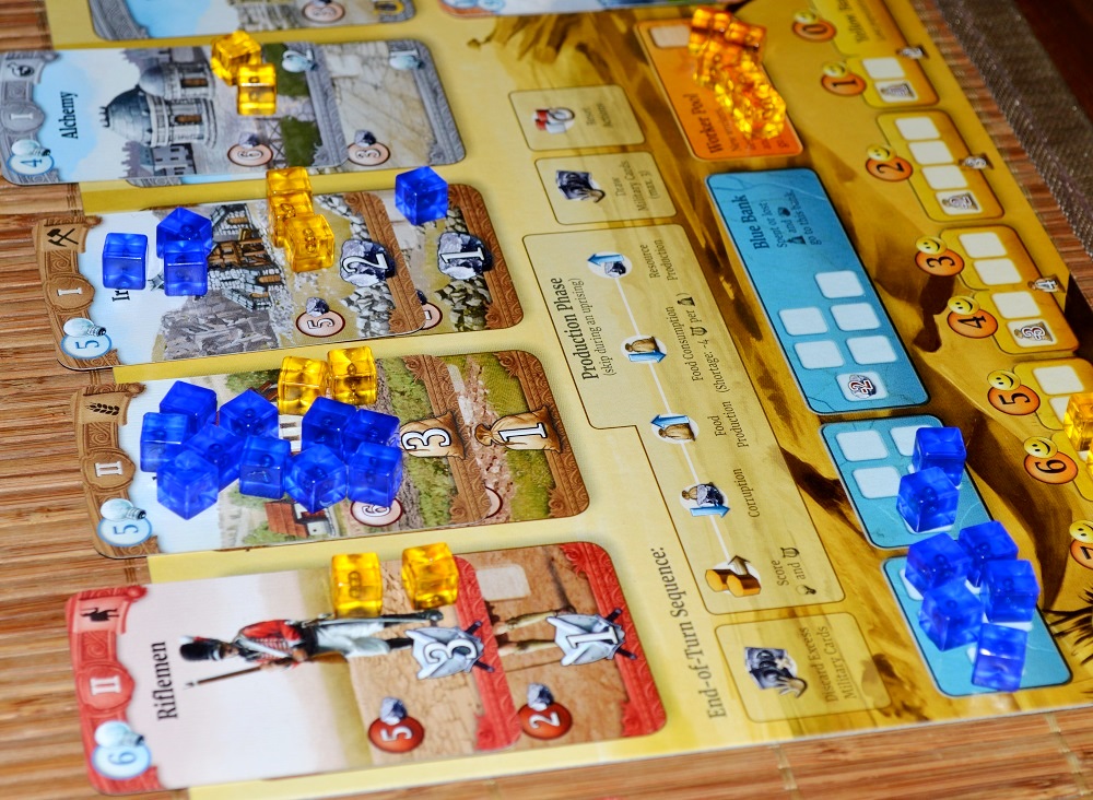 Потом происходит проверка на коррупцию – если игрок хомячит и не тратит запасы, то часть ресурсов придётся отдать ненасытным чиновникам. Далее производится еда, часть которой уходит на содержание населения; добываются ресурсы и, наконец, добираются военные карты (по одной за каждое непотраченное военное действие). И только теперь ход переходит к следующему игроку. Он частично обновляет рынок гражданских карт и приступает к выполнению своего набора действий.