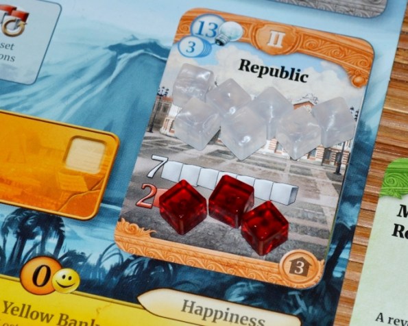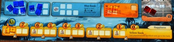 Стоит ещё отдельно рассказать про уровень удовлетворённости населения, или попросту счастья. За это отвечает трек, расположившийся над запасом жёлтых кубиков на планшете игрока. Уровень счастья повышается, как и другие параметры, с помощью эффектов карт.