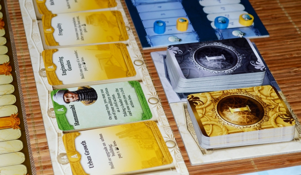 В центр стола помещается поле-рынок, куда выкладываются гражданские карты стартовой эпохи. Она продлится буквально пару раундов (даже полтора, т.к. первый урезан по числу доступных действий), после чего настанет время трёх полноценных эпох. Полноценных потому, что в них появятся военные колоды.