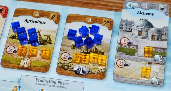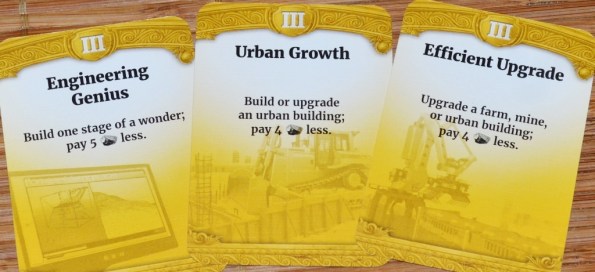 Здания можно не только строить с нуля, но и улучшать, платя разницу в ресурсах. В этом случае жёлтый кубик переносится на карту новейшей технологии (в зоне игрока технологии складываются лесенкой по типам). К слову, жёлтые кубики зданий не возникают из вакуума, они добываются из запаса населения, где за них придётся платить едой.