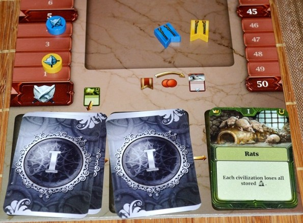 Кубики размещаются в указанные ячейки планшета, а маркеры – на вспомогательные поля, отвечающие за уровень науки, культуры и военную мощь каждой цивилизации. Научный и культурный треки двойные: одна шкала указывает на запас, а другая, скажем так, на приток данного показателя в конце хода.