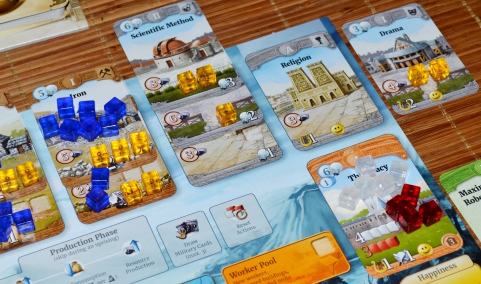 Мало просто набрать карт в руку, их ещё нужно выложить. За одно гражданское действие игрок может изучить технологию, заплатив требуемое количество науки. Но, как известно, на голых знаниях далеко не уедешь, поэтому, чтобы производственные и городские технологии начали приносить плоды в виде еды, ресурсов, очков науки и культуры (победные очки!), карты технологий нужно снабдить соответствующими постройками, которые возводятся за те же ресурсы (уточню, что ресурсами тут называется всё, что добывается в шахтах).