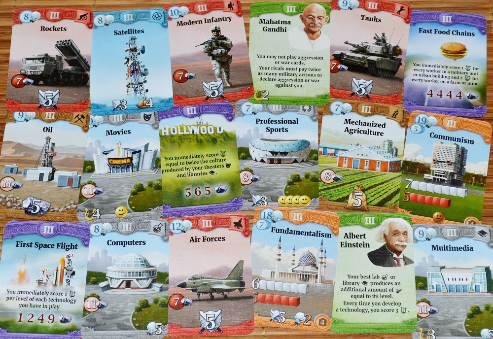 Если во время обновления рынка эпоха заканчивается, то сначала игроки сбрасывают из запаса по два кубика населения, а потом проверяют свои империи на наличие карт древних эпох – с ними придётся расстаться. К примеру, когда заканчивается вторая эпоха, то некоторые карты первой (недостроенные Чудеса, постаревшие лидеры, карты на руках игроков) уходят из игры. Это добавляет процессу логичности, хотя казусы в виде копейщиков в век компьютеров всё ещё имеют место быть. Просто было бы слишком жёстко ломать уже выложенные карты.