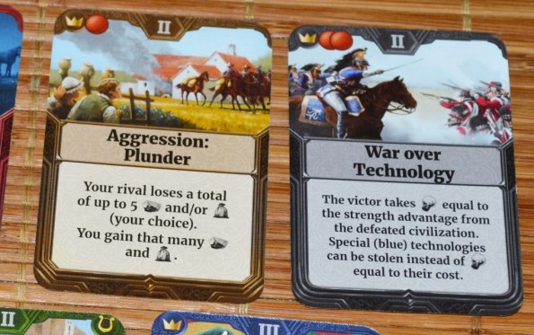 В отличие от агрессии, во время войны нельзя играть защитные карты, во внимание берутся только отряды, так сказать, на поле боя, то есть те, что находятся в зоне игрока, а также бонусы технологий, лидеров и Чудес. Кроме того, в войне всегда будет победитель, а награда будет зависеть от разницы в силе. Допустим, в случае “Культурной войны” победитель получает 5 очков + дополнительные очки согласно превосходству на военном треке.