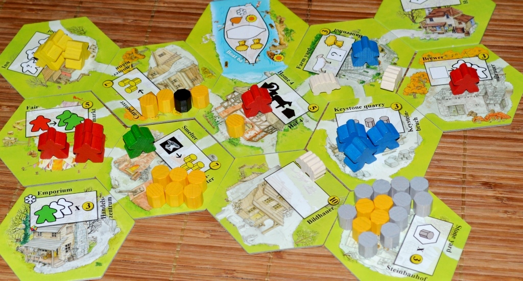 Про вариативность я вообще молчу. Мы играем с двумя дополнениями (не используем лишь пристройки и домики) и тайлы деревни на аукцион выбираем абсолютно случайно. Так вот, партии выходят кардинально разными и порой даже забавными. К примеру, в одной у нас шла ожесточённая борьба за единственную локацию с камнем, а в другой, наоборот, в ресурсах мы просто купались.