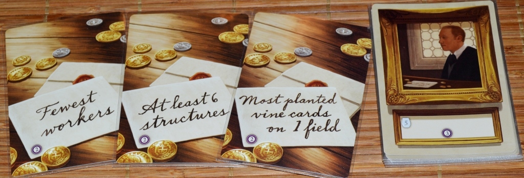 Аналог карт-патронов из Legacy: The Testament of Duke de Crecy. В начале партии каждому выдаём по случайному покровителю, которому потом можно будет толкнуть любую бутылку вина ценностью 5+ (вместо стандартного выполнения заказа). За это получаем 3 очка и одновременно открываем доступ к мини-цели. За её успешное выполнение в конце партии получим ещё 2 ПО.