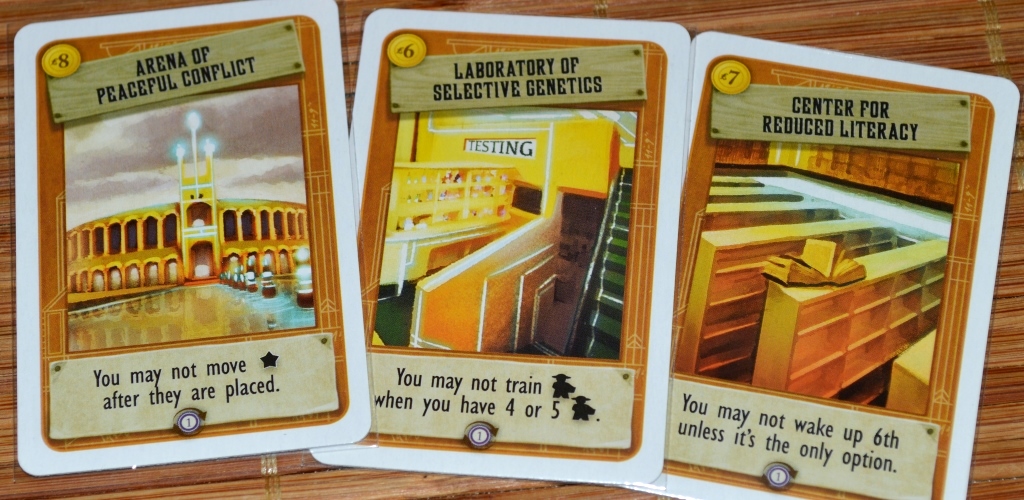 Одни приносят пользу на постоянной основе (к примеру, добор определённой карты каждый раунд), другие поощряют игрока при каких-то условиях, третьи представляют собой ячейки под рабочих с всевозможными действиями (халявный найм дополнительных миплов, очки за сброс вина из погребов и т.д.).