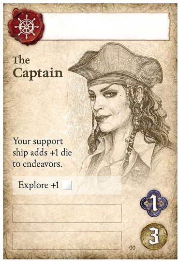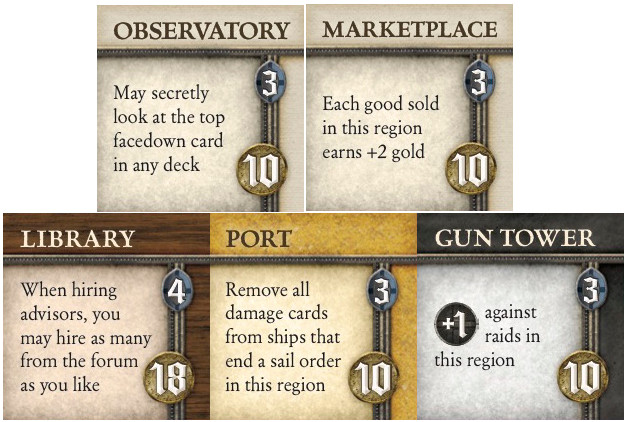 В свой ход можно сперва купить карту сокровищ (ту, что приносит славу) или нанять и активировать советника. Советники – это граждане провинций, которые всюду суют свой нос и готовы помочь за скромное вознаграждение (или очки репутации). Они обладают полезными свойствами и одновременно повышают характеристики кораблей.