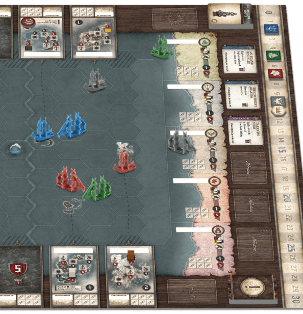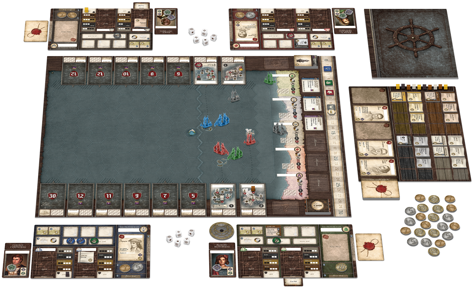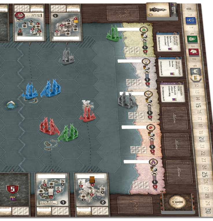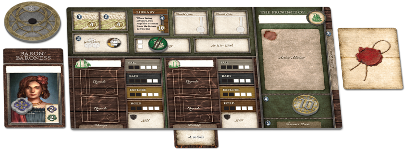 Каждому игроку достаётся персональный планшет провинции, карта лидера и два кораблика, которые тут же помещаются в домашнюю гавань.
