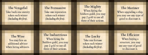 Свойство обычно усиливает одно из базовых действий, удача увеличивает вероятность успеха при бросках кубиков (во время исследования или сражений), а репутация позволит склонить на свою сторону нейтральных советников (и за них не придётся платить золотом).
