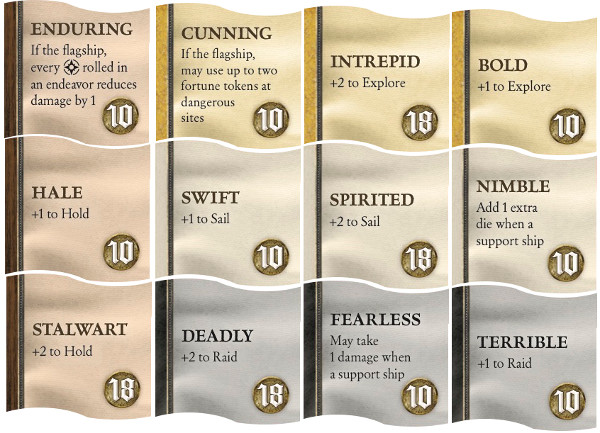 Основных характеристик у корабля четыре: набег показывает, сколько кубиков бросает игрок во время рейдов; исследование – тоже самое, только во время открытия новых территорий; парус отвечает за число клеток при передвижении; а трюм – за количество перевозимых товаров.