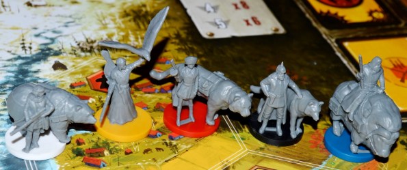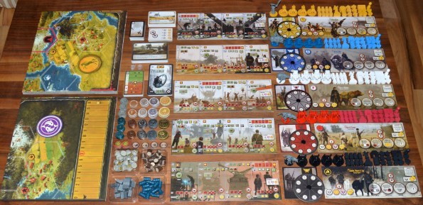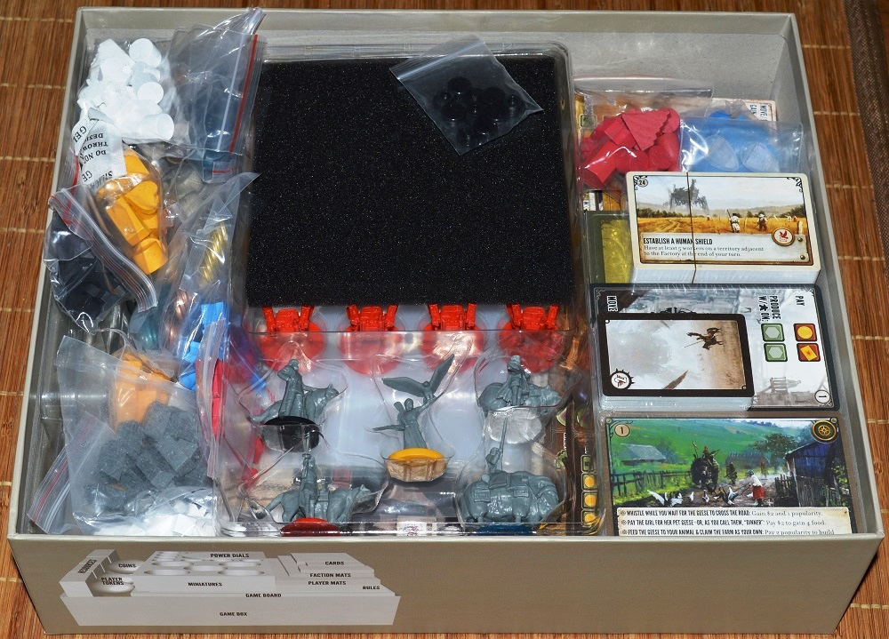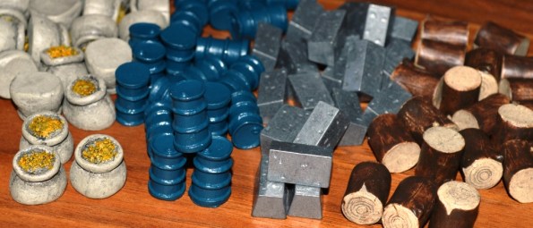 Несмотря на внушительный и богатый стол, компонентов не так, чтобы очень много. Чуть больше сотни карт, 25 фигурок, 80 фишек ресурсов, 80 монет, планшеты и фишки игроков, поле и всякие жетончики по мелочи. Обычный такой набор среднестатистической стратежки.