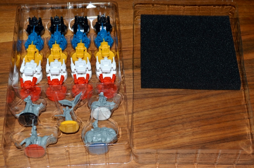 Далее стартовые наборы игроков. Каждому достаётся фигурка лидера, четыре боевые машины, фишки рабочих и зданий, плюс различные маркеры.