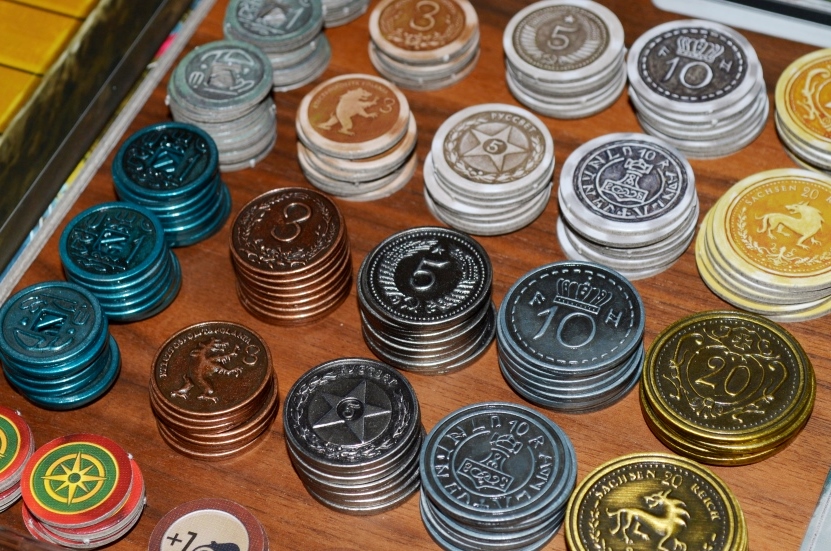 Сперва уточню, что такое Collector’s Edition. Коллекционное издание – это: 1) специальные покрашенные ресурсы (вместо деревянных фишек); 2) металлические монеты (вместо картонных жетонов); 3) дополнительное увеличенное игровое поле (гексы больше на 50%).