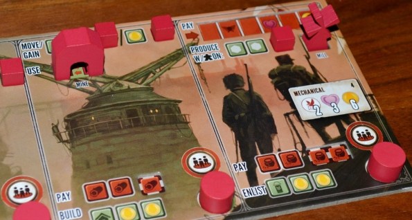 Помимо планшета фракции, на котором указано уникальное свойство и четыре способности “мехов”, игроки выбирают дополнительный планшет с действиями и местами под фишки построек и технологий. Действия и их стоимость на этих планшетах тоже отличаются. Получается, что для каждой фракции имеется пять различных сочетаний планшетов.