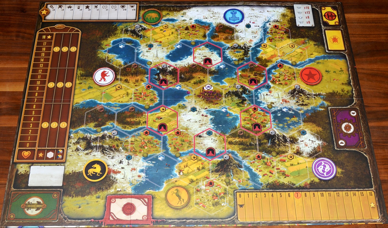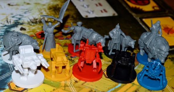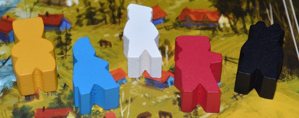 Как заявил автор, фишки рабочих, выполненные из дерева (забавно, что каждой фракции соответствует свой головной убор), подчёркивают контраст мира Scythe, в котором сосуществуют громадные железяки-роботы и обычные крестьяне. Не знаю, отмазка ли это на то, что издатель сэкономил на миниатюрках крестьян, но, согласитесь, объяснение красивое. Посмотрим, будет ли это бросаться в глаза во время партии.