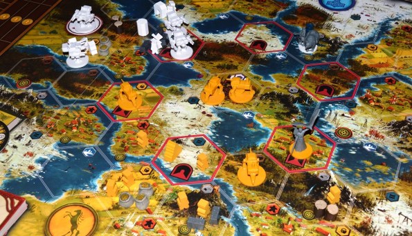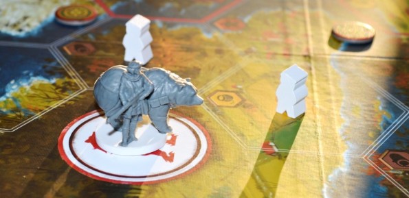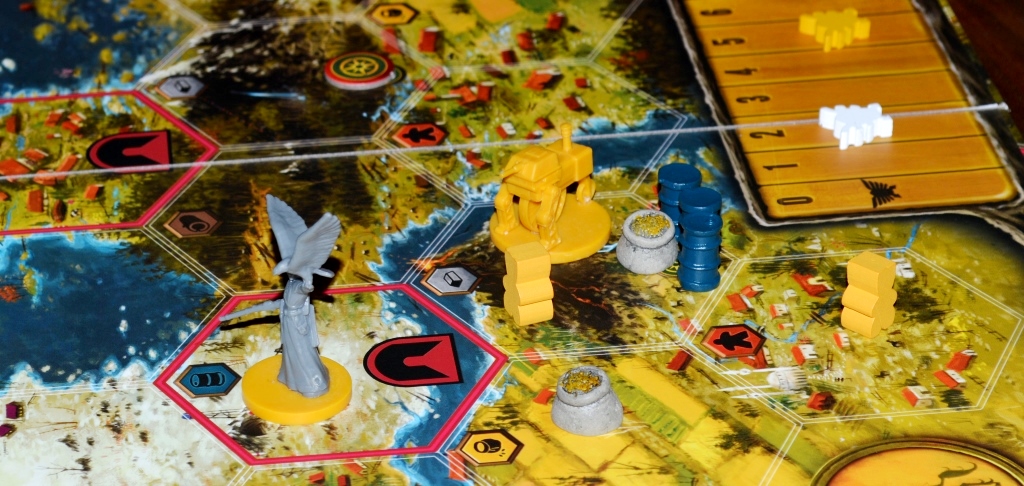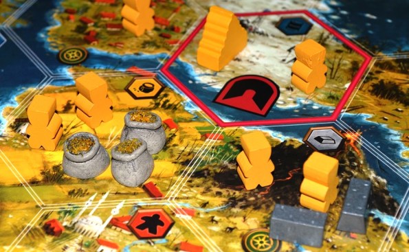 Конфликт. Как правильно заметили на BGG, это игра не про войну, а про нагнетание угрозы. Для звёзд нужно всего две успешные атаки, поэтому бить всех налево и направо большого смысла нет. Побороться стоит только за центральный гекс, который по очкам в три раз ценней остальных. Кроме того, военные издержки в виде потери силы, репутации и драгоценных ходов на восстановление зачастую себя не оправдывают. Да и жертва при должных апгрейдах на движение может дать отпор чуть ли не в следующий ход (напомню, что отряды не погибают, а просто возвращаются на “базу”).