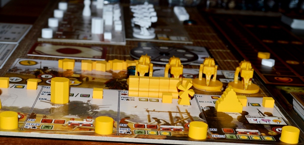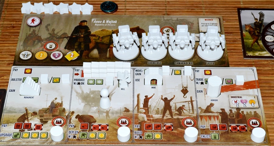 Но! У медали есть и обратная сторона. К тому моменту, когда игрок построил все здания и выпустил на поле всех своих мехов, дополнительных бонусов с нижней части планшета он уже не получает. Да, есть мелкие ништячки за снятые recruit-фишки, но лично меня постигло лёгкое разочарование, что с такими усилиями и трепетом налаженный движок, по большей части, себя исчерпал.