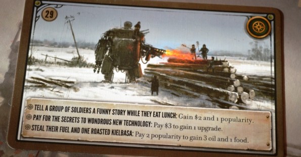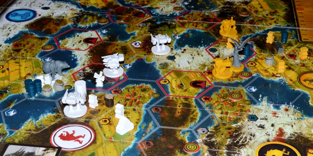 Лично я не особо расстроен этим, так как ждал от игры именно евро-стратегии с мелкими вкраплениями агрессии. Кстати, безрандомная боёвка на крутилках и картах оказалась вполне годной и лаконичной, – понравился нюанс, что боевых карточек можно докладывать столько, сколько мехов участвует в сражении.