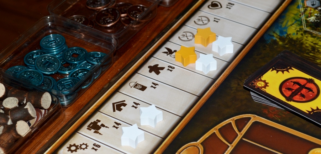 Очки. Это деньги, в которые в конце партии всё конвертируется. Интересное решение, когда от уровня репутации фракции зависит число победных очков за выложенные звёзды, подконтрольные гексы и накопленные ресурсы. Выходит, что выкладывание звёзд не самоцель, главное преуспеть везде, а выполнение шести условий из девяти – это лишь триггер окончания партии.