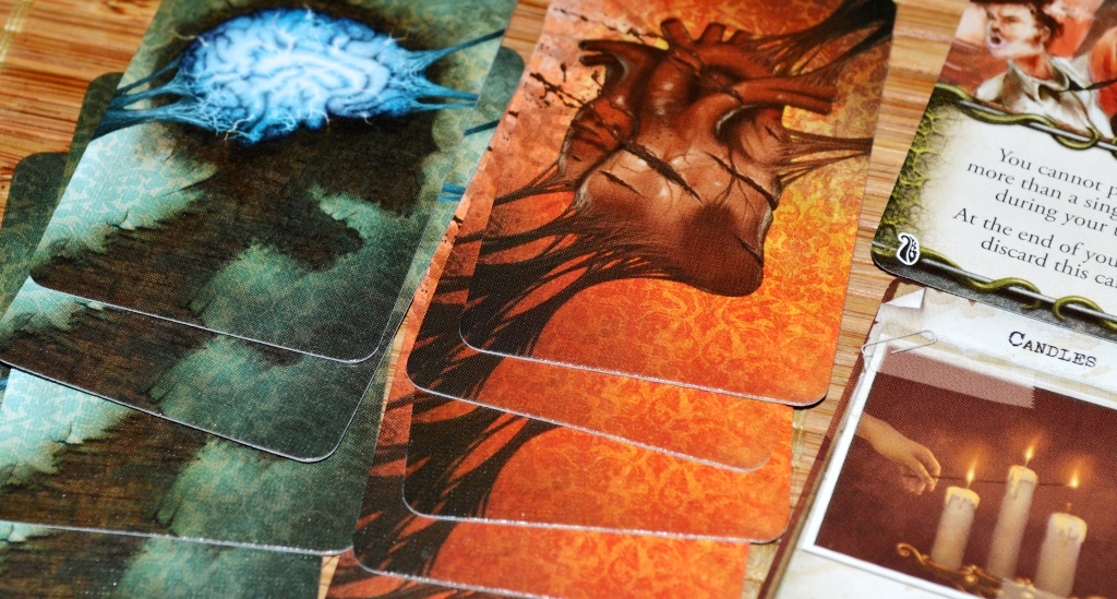 Теперь о моменте, который пока мне “не очень”. Это механика ранений. Как обычно есть два типа увечий: физические и психические. В случае неудачи игрок тянет карты из соответствующей стопки по числу ран. По умолчанию карты тянутся в открытую, но часто специально оговаривается, что ранения facedown. Когда карточка вскрывается, то зачитывается пакостный эффект (как в случае “крита” в Вингах). Иногда на обратной стороне может быть сказано, что, мол, ничего серьёзного, скиньте карту. В очень редких случаях бывает и бонус.