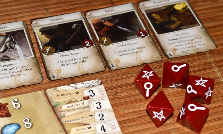 Забавно, что боёвка и система ранений частично позаимствована из X-Wing. Кубики восьмигранные с тремя возможными исходами: успех (знак древних), пустышка (промах) и лупа. Хех, вот мы и добрались до жетончиков улик, как же без них. Тут они используются, как жетоны фокуса в Вингах (за каждый сброшенный жетон можно перевернуть одну грань с лупой на успех), и дают дополнительные попытки при решении головоломок.