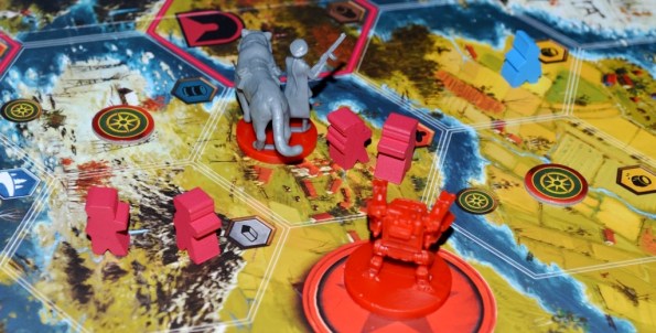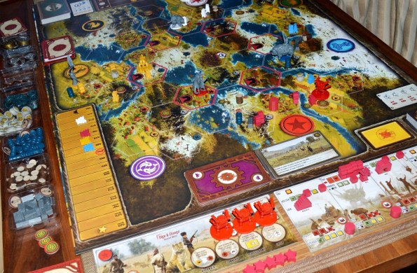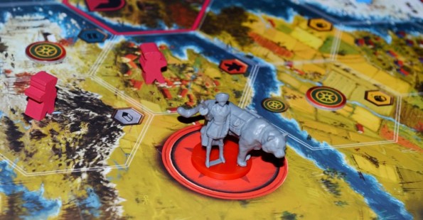 Так что, если вы ждёте постоянных стычек а-ля Кемет, то вас постигнет разочарование. Мне, кстати, больше всего игра напомнила Hyperborea: почти всё внимание приковано к навороченным планшетам, вместо бонусных жетончиков руин карты контактов с крестьянами, важность центрального гекса, воистину “еврошные” цели.