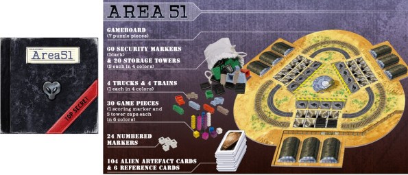 Area 51: Top Secret. Компактное евро на программирование действий и доставку грузов. Понравилась тематика: игрокам нужно оборудовать вместительные военные хранилища и с помощью продуманной логистики доверху забить их опасными грузами (оружием, секретным оборудованием и даже трупами пришельцев).