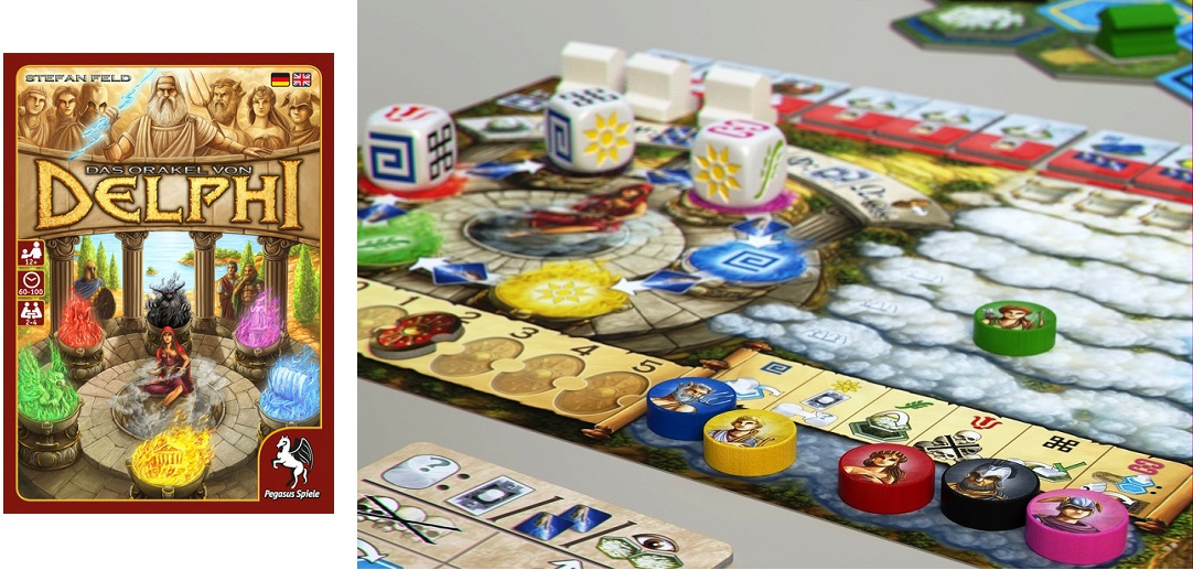The Oracle of Delphi. Третья игра тоже от плодовитого мастера, но уже от Штефан Фельда. Плаваем по морям с целью выполнить 12 заданий Зевса: собрать подношения и доставить их в определённые храмы или убить конкретных монстров, затаившихся на островах. Как всегда, действия выполняются через оригинальную систему манипуляций с цветными кубикам. Звучит интересно, но не так хардкорно, как A Feast for Odin.