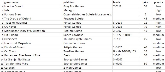Вечер третий. В получившемся экселевском файлике с информацией об издателе, стенде и цене расставляют приоритеты: low, medium, high. Если будет время, то low охотно попробую на выставке. А вот насчёт medium и high надо бы поспрашивать издателей/авторов (кого легче найти на BGG) насчёт скидки или даже бесплатной копии для обзора, благо, с некоторыми контакт уже налажен. Но за часть игр всё равно придётся платить по полной – большим компаниям всё равно, что ты какой-то там Владимир из Латвии, вот уже почти 6 лет пишущий о настолках для русскоязычной аудитории. И в этом нет ничего обидного – таких блогеров тысячи, да и я не Том Вэсел, не Радо и не Родни Смит.