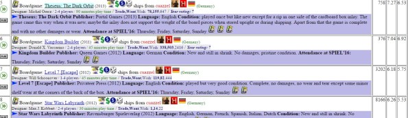 Вечер шестой. Срок подачи лотов окончен, теперь можно формировать вишлист. Потирая ручки, захожу в адски неудобную программку для math trade-ов, нахожу свой и начинаю выбирать. Энтузиазм пропадает после прокрутки первой сотни, а осталось ещё 2700… Под конец тупо тыкаю select all, лишь бы это поскорей закончилось. Последний штрих – страхуюсь от дубликатов. До сих пор смеёмся над другом, который получил 5 Kingdom Builder-ов.