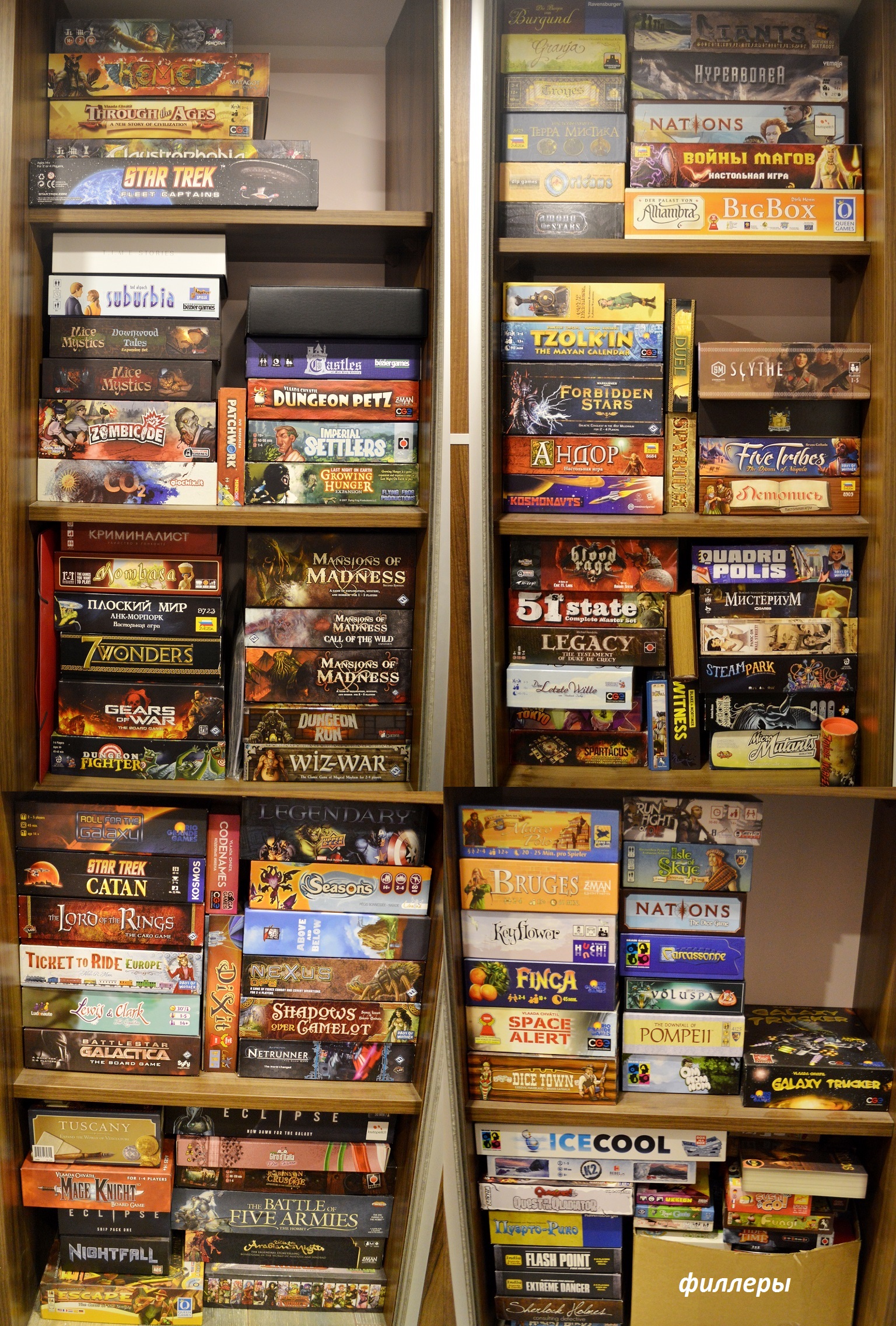 Другое дело! Как видно, с тех пор я обзавёлся специальным местом для хранения настолок, замаскированным под обычный раздвижной шкаф. Стоит он в прихожей, где особо не развернёшься, поэтому фотографию пришлось “склеивать” из четырёх кусков.