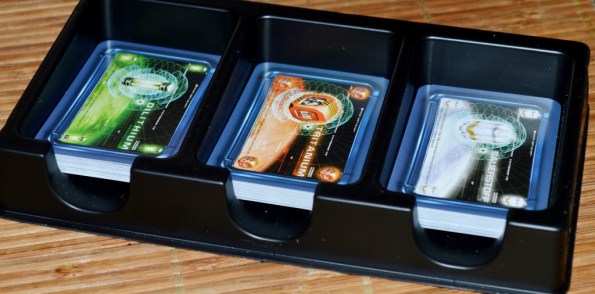 Что сказать, внешний вид, конечно, прикольный: отдельный органайзер для карт, кораблики, станции, улучшение станций посредством насаживания на них “шапочек”. Хотя корабли вместо дорог не самый удобный и наглядный вариант (и логичный), так как уже к середине партии поле представляет собой беспорядочное месиво из цветных Энтерпрайзов.
