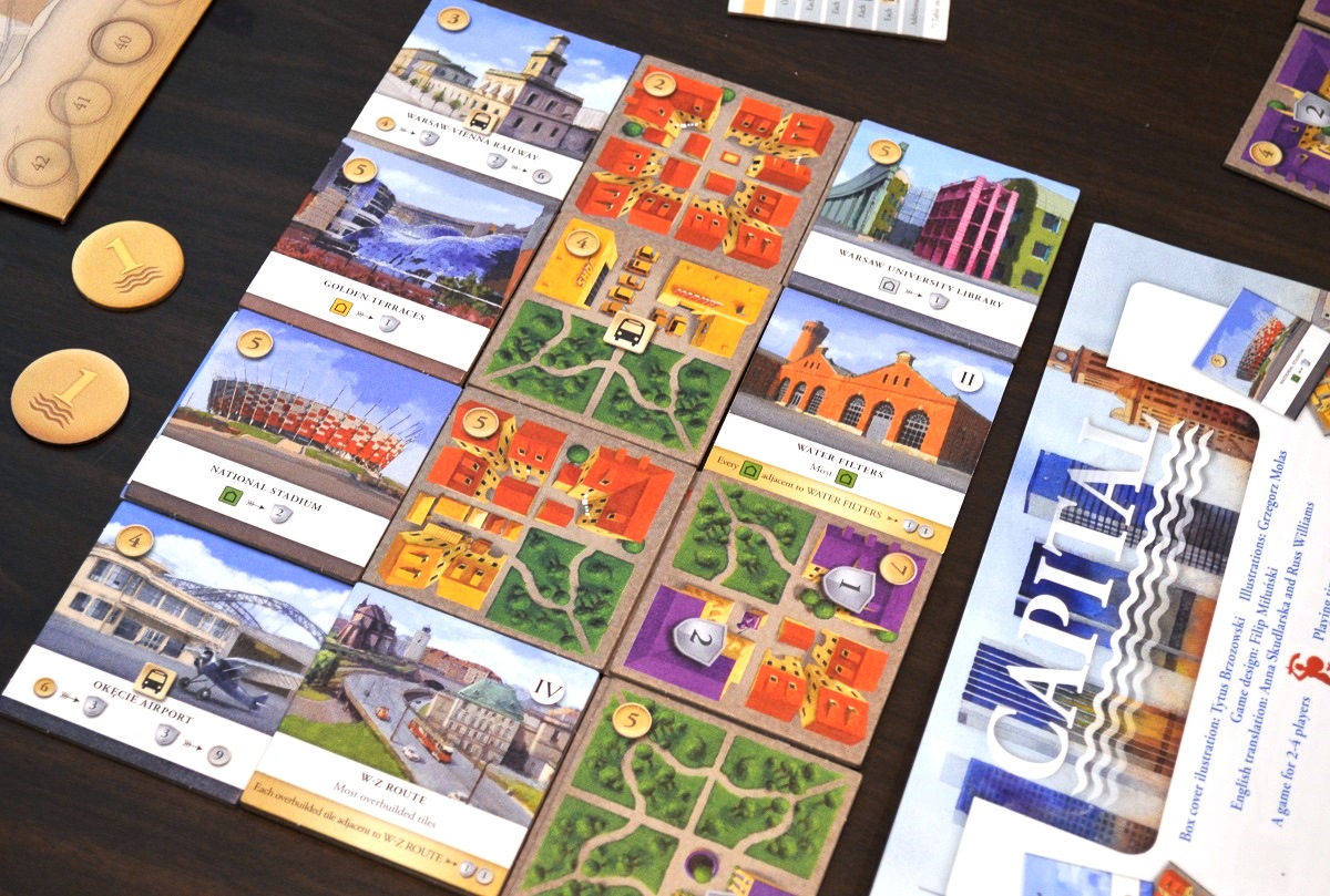 Дальше начал искать свободные столы с интересующими наименованиями. Сперва отыграл целую партию в Capital от Granna. В принципе, ничем не примечательный tile placement. Драфт тайлов и сброс ненужных за 3 монеты, как в Чудесах, стандартные начисления очков за типы и т.п. Добавляем к этому унылое оформление и получаем совсем проходную игрушку.